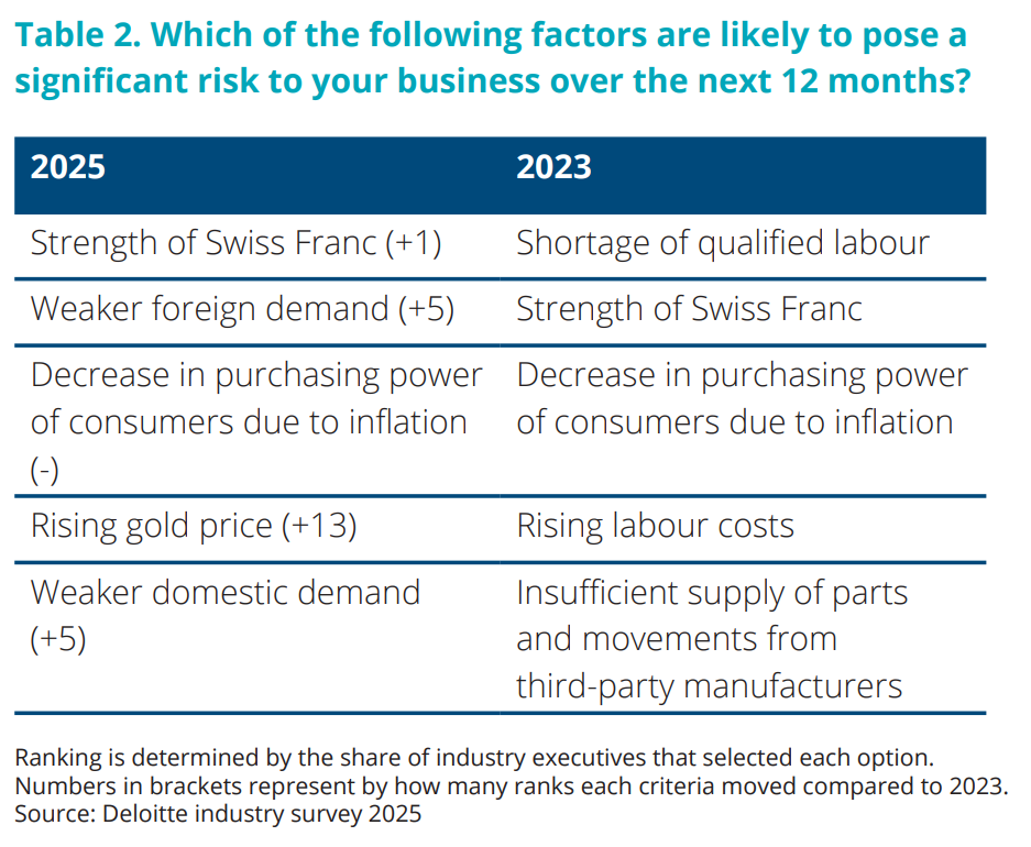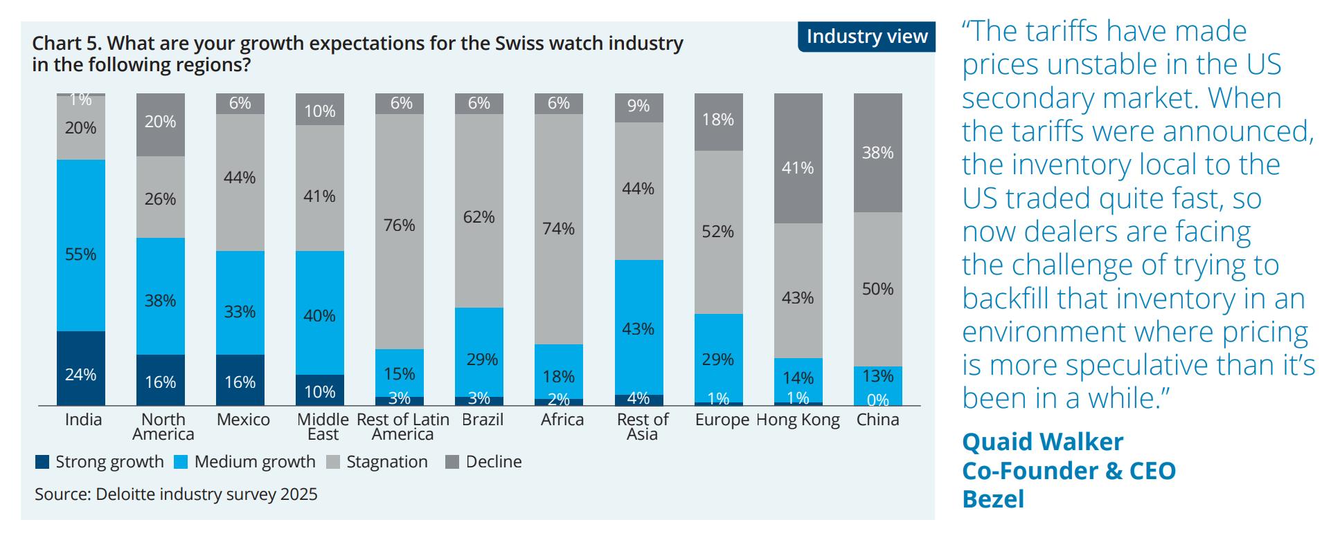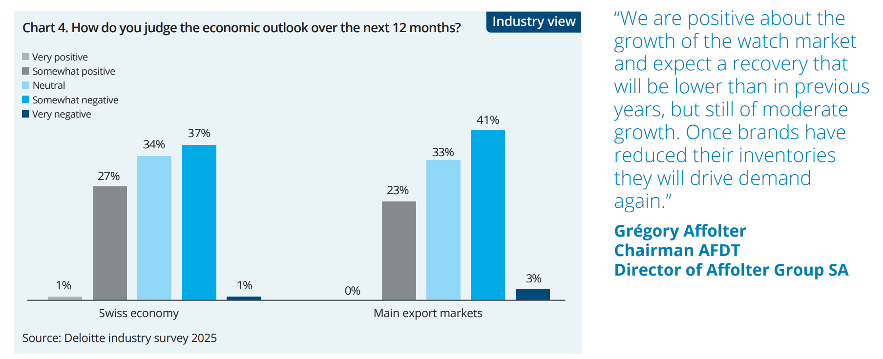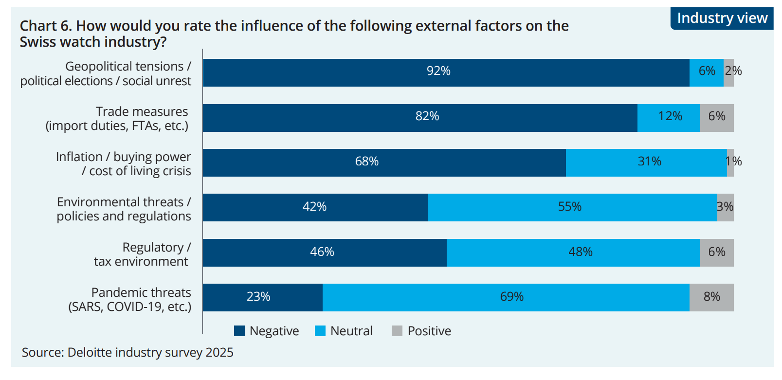The Swiss watch industry entered 2025 with cautious optimism, but by mid-year, that sentiment had been thoroughly put through the wringer. Deloitte’s eleventh annual study of the Swiss Watch industry1, surveyed 111 senior executives and 6,500 consumers across twelve markets between June and July 20252. This timing is important because the research happened before Trump raised US tariffs on Swiss watches to 39% in August. This means the industry’s mood was already negative, facing “only” 10-31% tariffs, and the 39% slap just made the bad sentiment even worse.