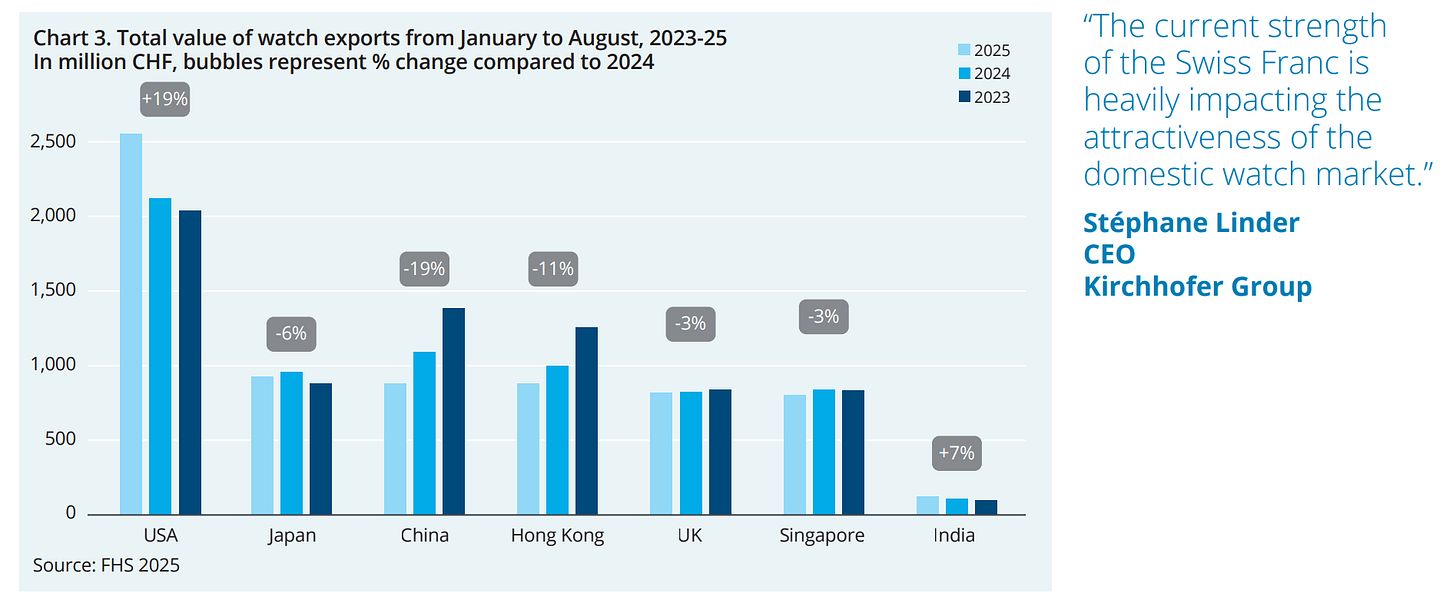 Whilst the US surged (artificially) and then contracted, Asia was a different story. China and Hong Kong combined, represented 15% of Swiss watch exports in 2024, down from much higher levels in 2021. Exports to China fell to CHF 2.1 billion in 2024, which is a 26% year-on-year decline and 31% below 2021 pandemic levels. Hong Kong dropped 19% compared to 2023, reaching CHF 1.9 billion.