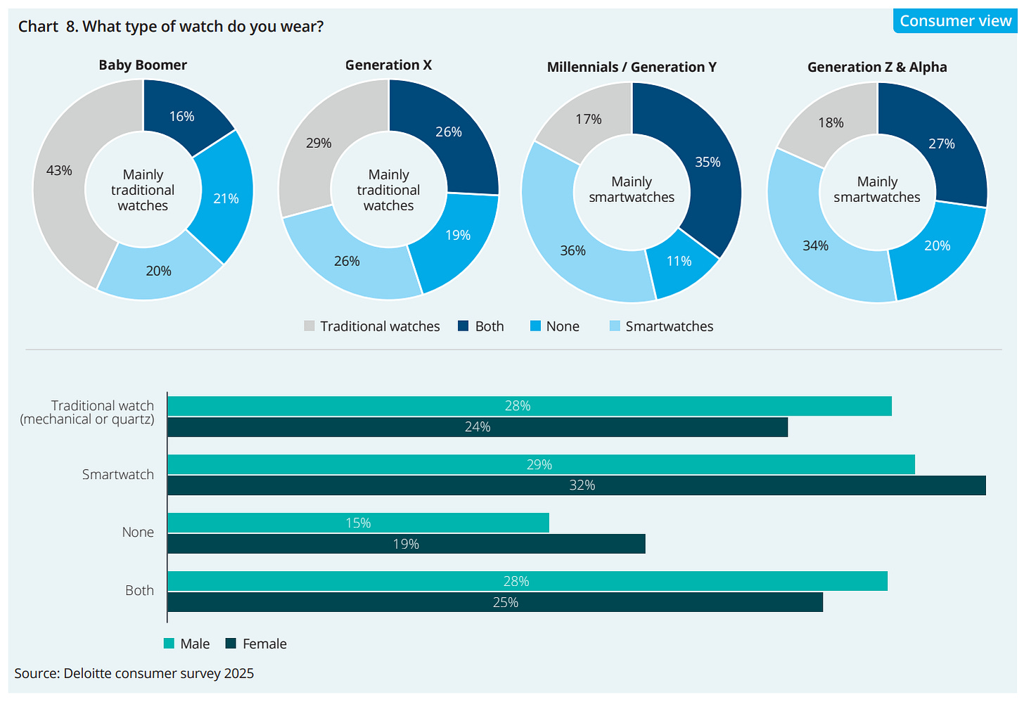 The share of women wearing traditional watches has “increased slightly” compared to 2024. More importantly, purchase intent for traditional watches is now equally strong among men and women, which marks a major shift from the male-dominated collecting culture of the past.