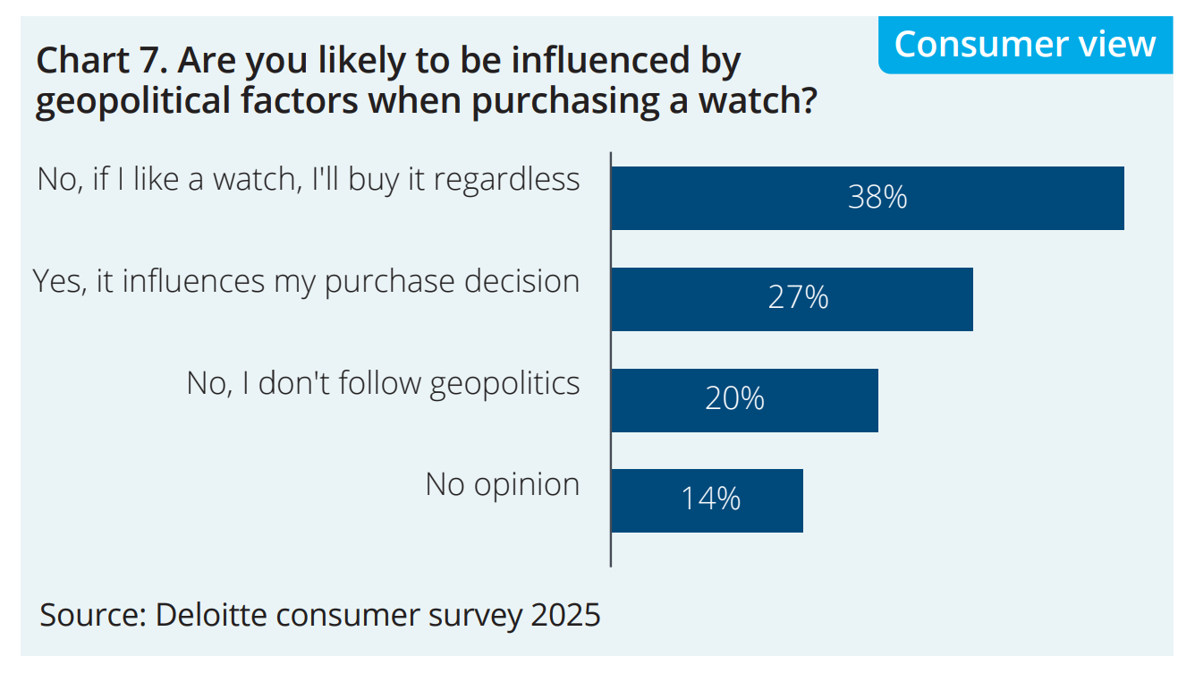Labour shortages and rising labour costs dominated the 2023 survey, but these seem to have receded as concerns as companies are now focused on external pressures not internal operational challenges. When asked about external factors, over 80% judged trade measures as having a negative influence on business, and over 90% saw geopolitical tensions as even more disruptive. Consumers however, seem to be divided; 27% say geopolitics influences their purchase decisions, and 38% insist they’d buy a watch regardless.