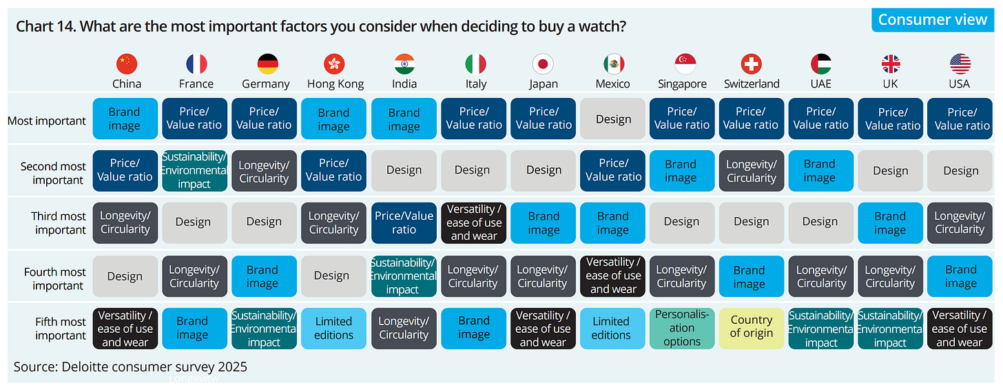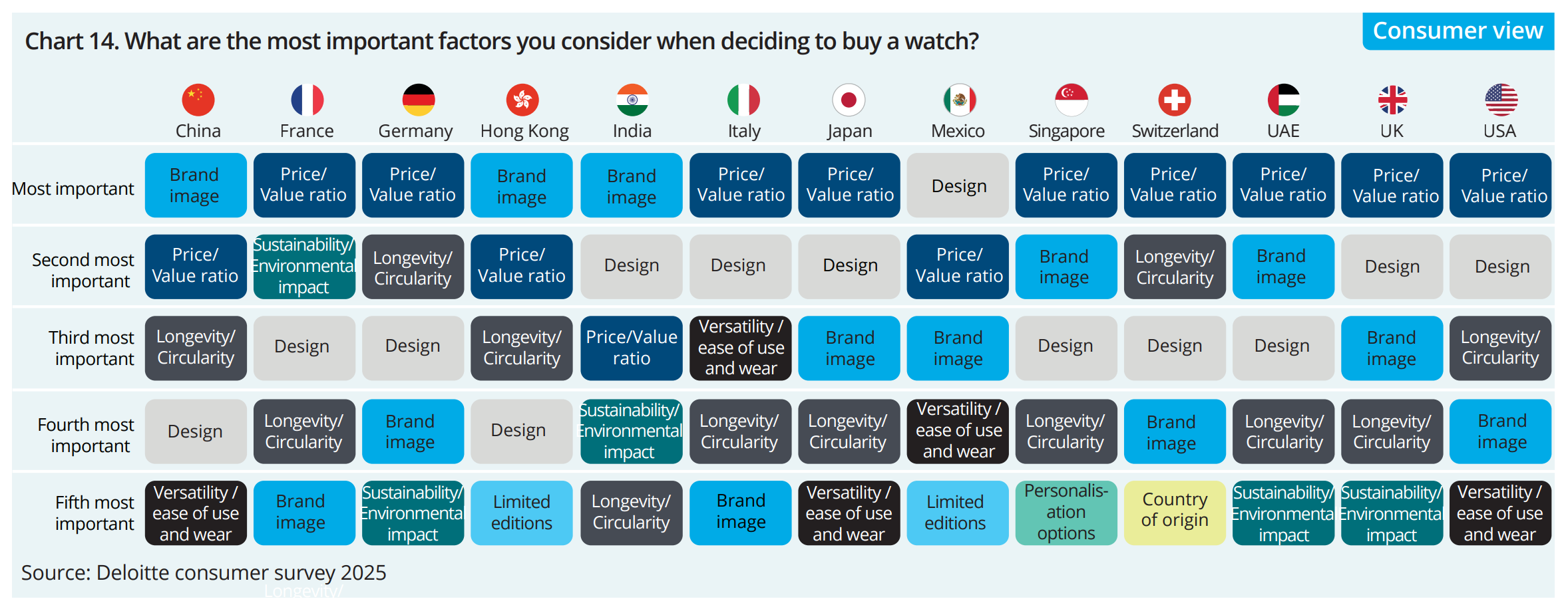 The factors consumers prioritise when buying a watch vary significantly by market, and the report shared this interesting table: