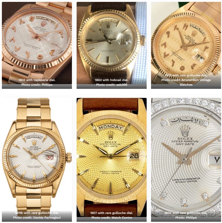 Luxury Bazaar has a guide on Rolex dials, which includes many Day Dates and Cellini models with guilloché dials