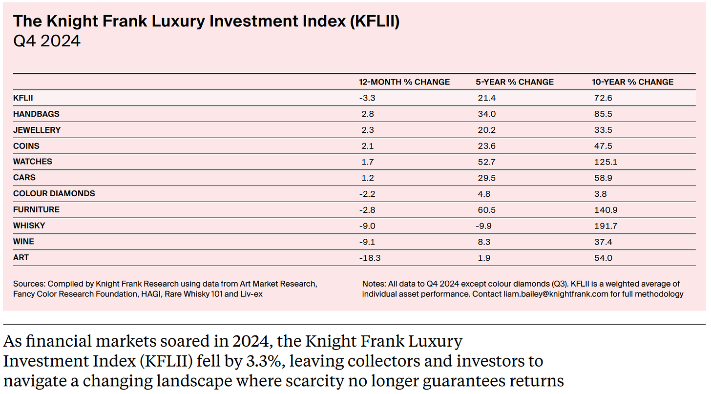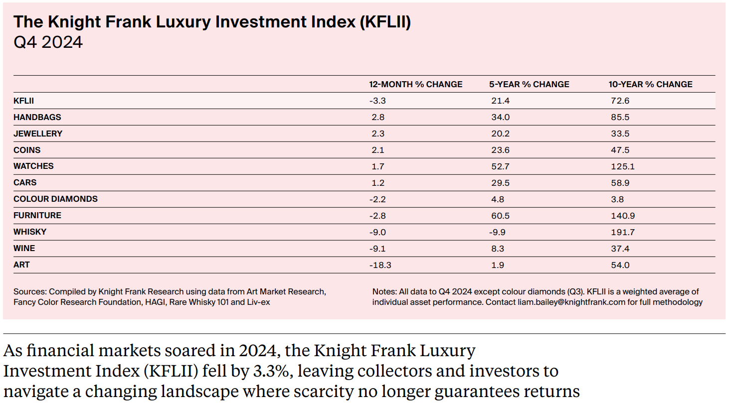 But watches are the least crazy part of this story; as you can see, they don’t even feature in the “collectors’ corner” above! The Knight Frank Luxury Investment Index tracks all the stuff rich people convince themselves are investments, and this is down -3.3% in the last year. Now that doesn’t sound too bad until you realise that: