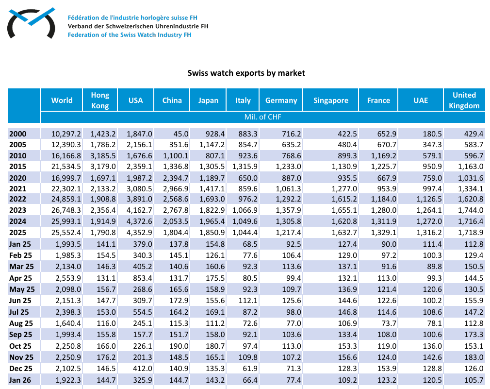 Exports dropped to 14.6 million units, and this is a multi-decade low. To put that in perspective, in 2011, the industry shipped nearly 30 million watches. We have effectively halved the output of the industry in 15 years, but hey, for now, revenue is up!