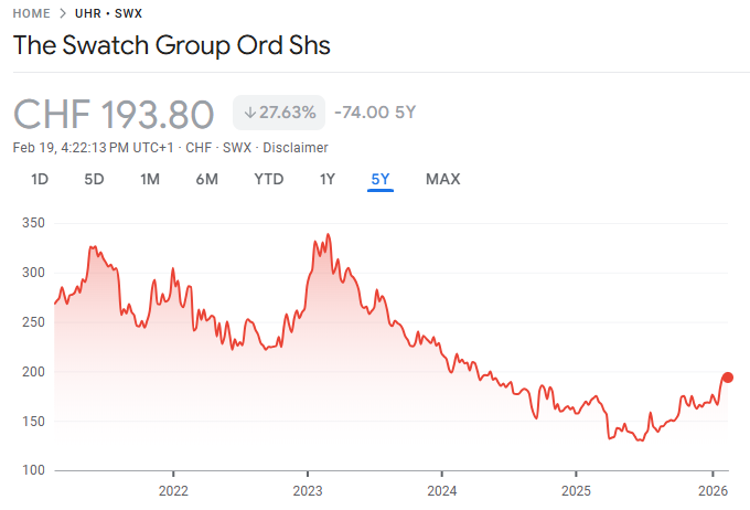 Going forward, we expect most investors to not find the long-term narrative on Swatch Group compelling and we expect the Group will continue to underperform the Swiss watch market in 2026.