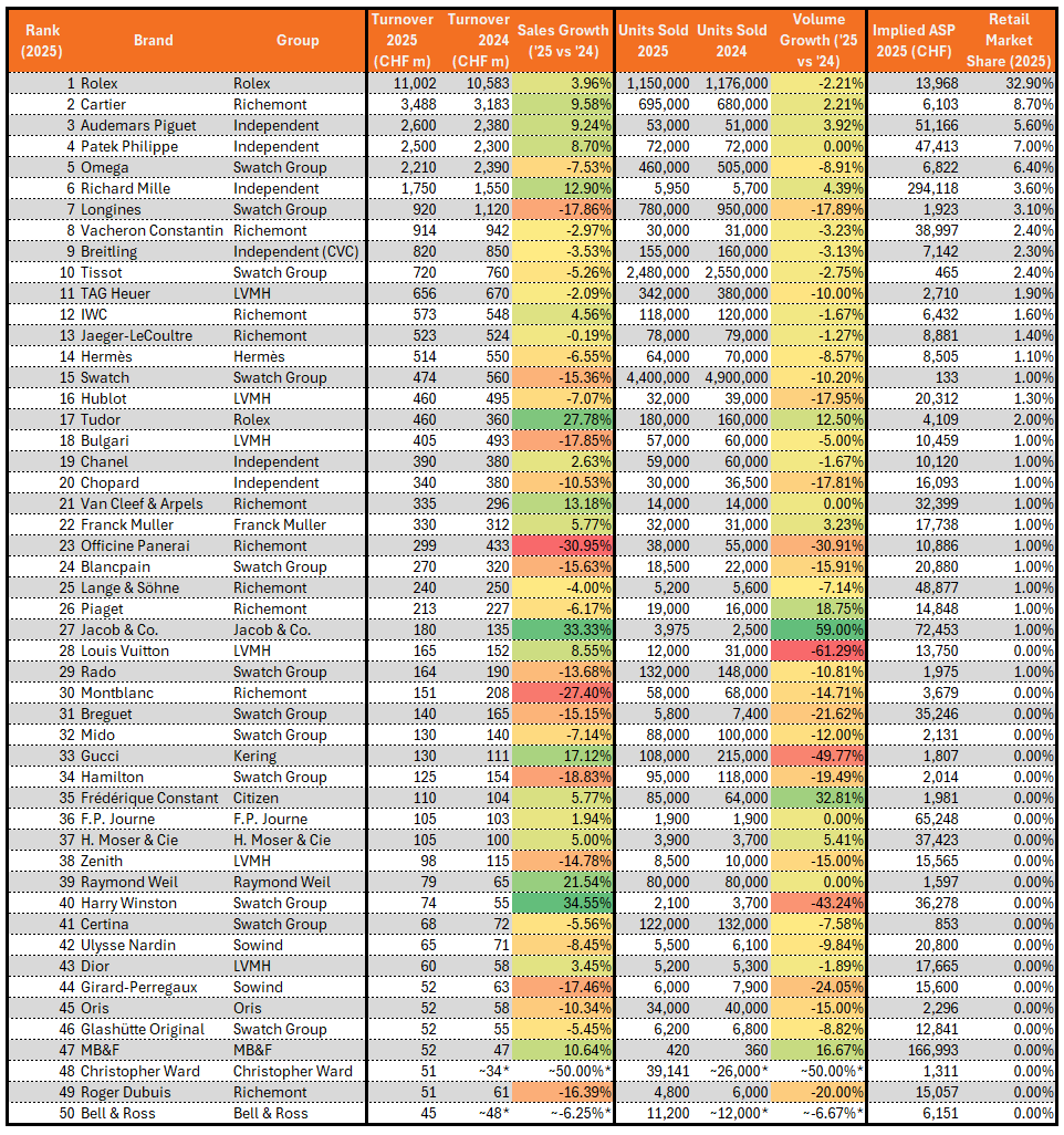 Swatch Group was the biggest market share loser for the sixth consecutive year, shedding another 220 basis points. Longines dropped below CHF 1 billion for the first time in over a decade and may now be loss-making. Cartier was the only listed-brand outlier, growing +10% to CHF 3.5 billion. Christopher Ward and MB&F both entered the Top 50 for the first time.