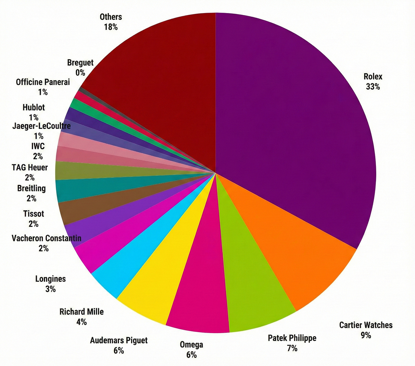 When Morgan Stanley started this report based on 2017 data, Omega held roughly 9% global market share and Rolex was at 23%. Here we are, 8 years later, and Omega sits at 6.4% and Rolex has grown to 32.9%. Hardly surprising to some… but probably surprising to their CEO, who once thought Omega would catch up to, and perhaps overtake Rolex lol!