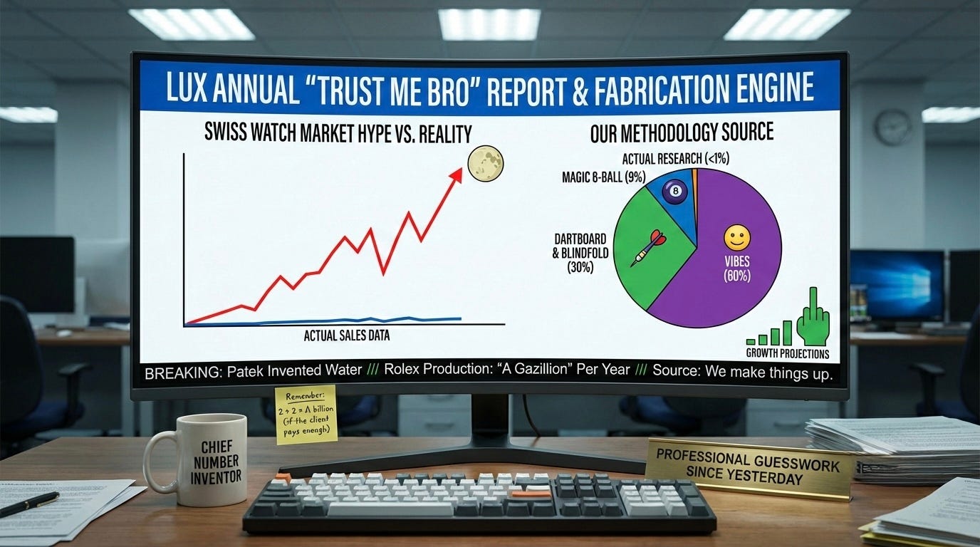 I will take this opportunity to remind you what this report actually is. These are estimates. Also known as educated guesses. Nobody at LuxeConsult has access to the audited financials of Rolex, Patek, AP, or any of the privately held brands that make this report interesting. Oliver and the Morgan Stanley team practice what you might call a dark art of triangulation… they look at Swiss export data, estimate wholesale-to-retail splits, talk to component suppliers, and then arrive at numbers that are presented with a confidence that somewhat exceeds the underlying precision.