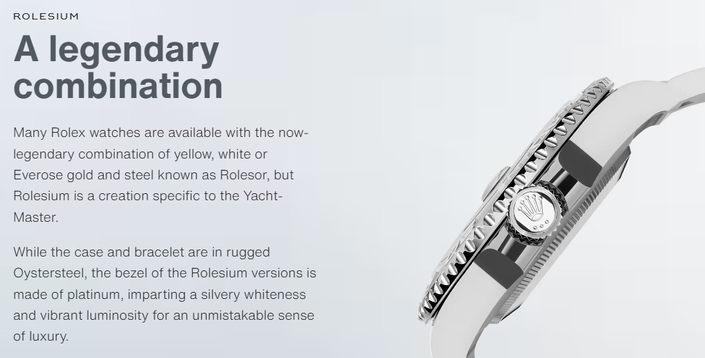 Their steel is not called “steel,” it’s called Oystersteel. Their rose gold is not called “rose gold,” it’s called Everose, and it contains a little bit of platinum to keep the pink from washing out - which is the sort of problem you only discover you have once you have sold a lot of rose gold watches to a lot of people who live in sunny places. Their steel-and-gold bimetal watches are called Rolesor. Their steel-and-platinum mix is Rolesium, a word Rolex has owned since 1932, when they originally used it to describe a proprietary steel that looked like platinum, and then retired the name and reused it 70 years later when they had platinum that looked like platinum.
