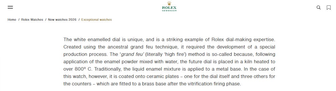 So if you are Rolex, and you have, factually and objectively speaking, invented a new dial construction, one would think that the Rolex move practically writes itself here. You can call it Cerafeu, or Emaillium, or Grandoyster, or whatever the hell you want - people will roll their eyes and still lap it up. Rolex names are often slightly worse than the real thing, and that’s fine, because the point of the name is not that it’s good but that it’s yours. Rolex would own the word. The press would have to explain the word every time they wrote about it. The word would, over the next few decades, accrue the same kind of premium that “Cerachrom” and “Everose” have accrued, where eventually the word itself is some kind of luxury “signifier”, even if it sounds divorced from what it originally described.
