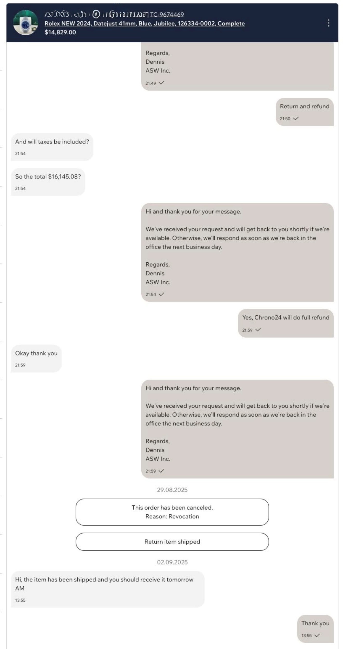 The dealer’s response also reiterates Chrono24’s fundamental uselessness in these situations. When disputes arise, the platform offers zero protection or resolution mechanisms. They collect fees while providing essentially no value when things go wrong.