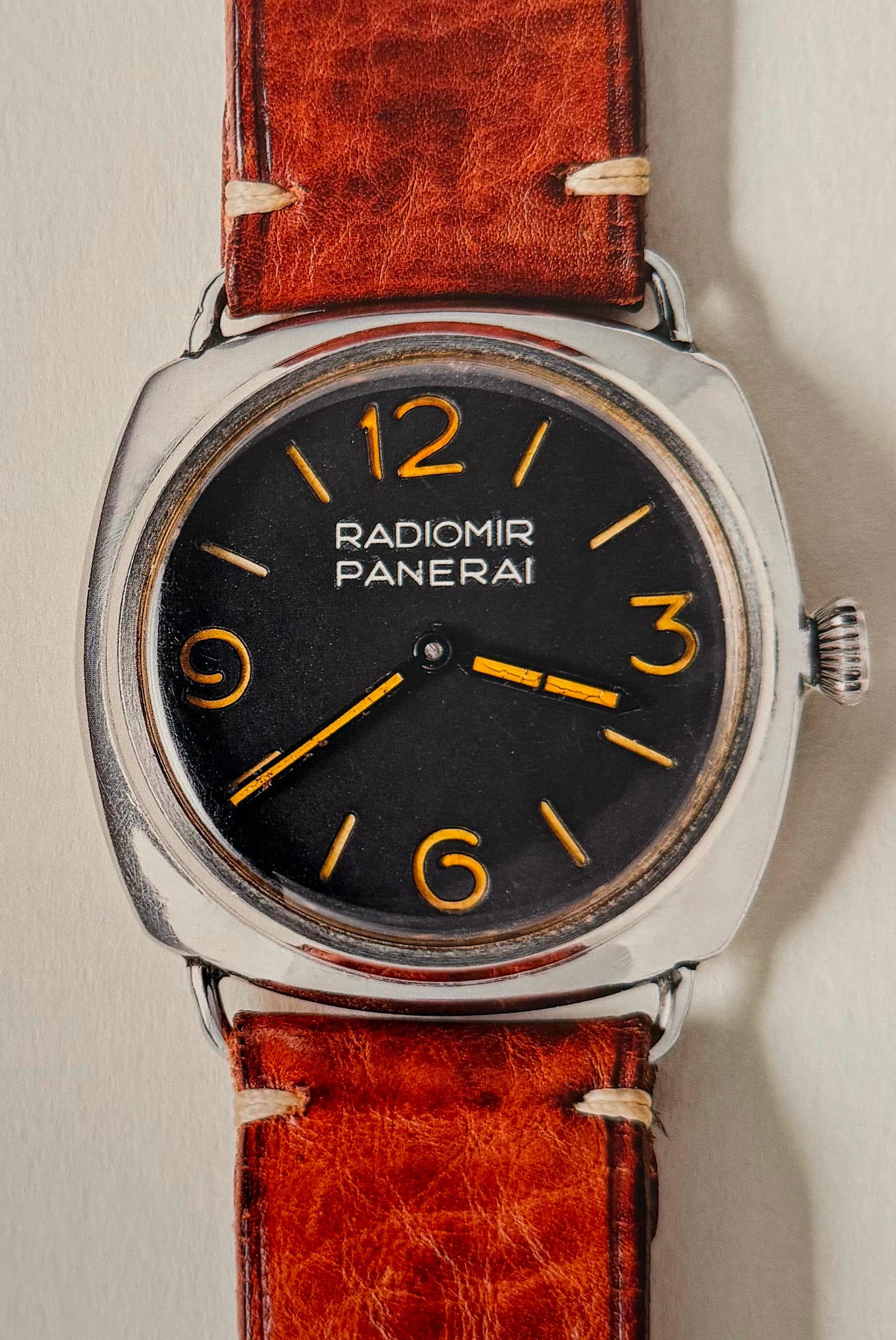 The dial construction Panerai developed is taken for granted now, but it’s actually a clever invention. They used two brass discs; the bottom one was thick-coated with radium and phosphor paste, and the hour markers and numerals were punched out on the top disc so the luminous material could shine through. You could apply way more lume this way than painting it on conventionally.