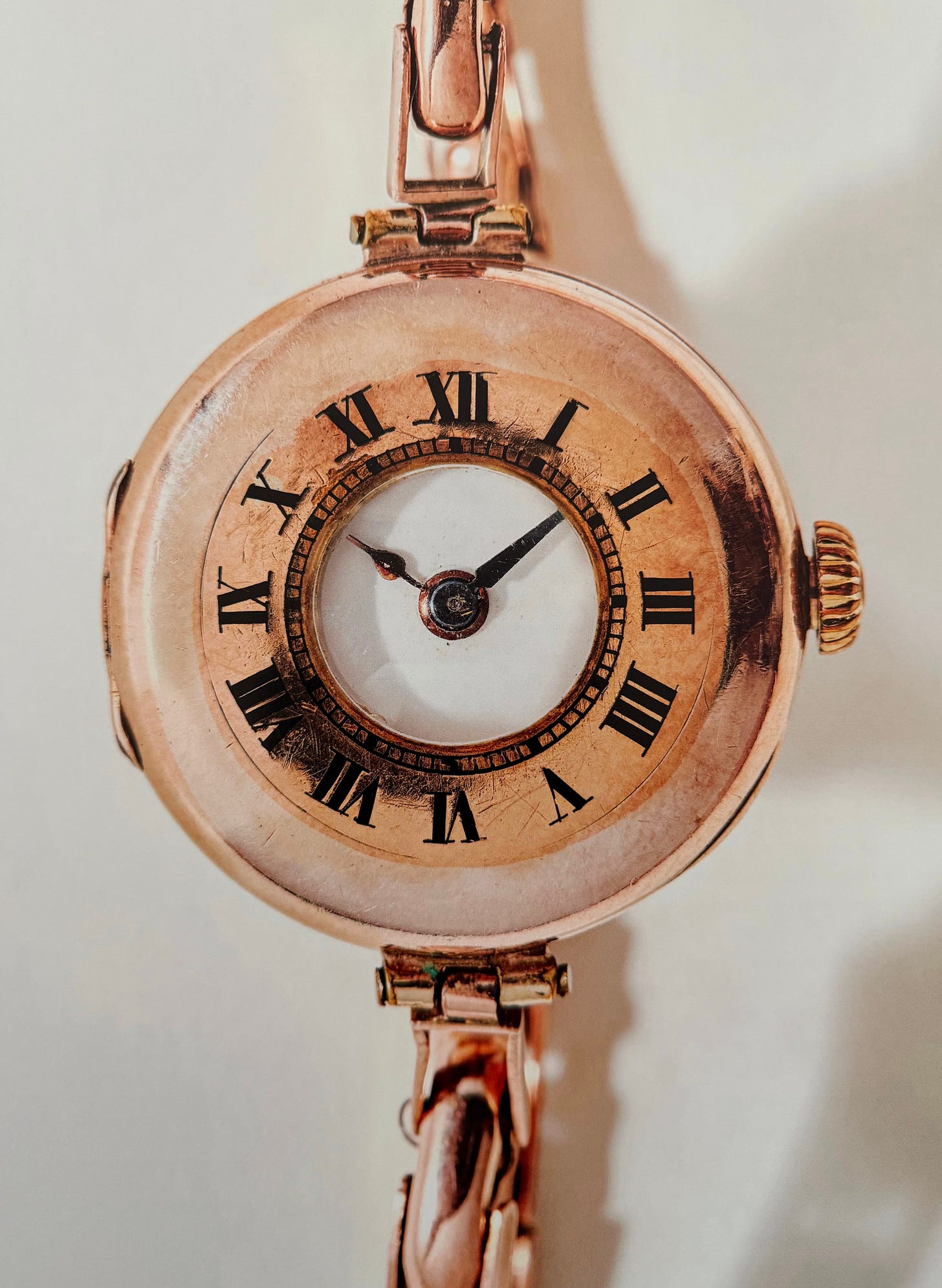 Dowling illustrates this period with a watch from 1912 that captures Wilsdorf’s emerging design philosophy. The watch features a brass dial with black fired enamel and radium numerals, housed in a sterling silver case measuring 35mm in diameter. The movement is a 13 ligne Rebberg calibre - one of those industrially produced movements that made the whole operation viable.