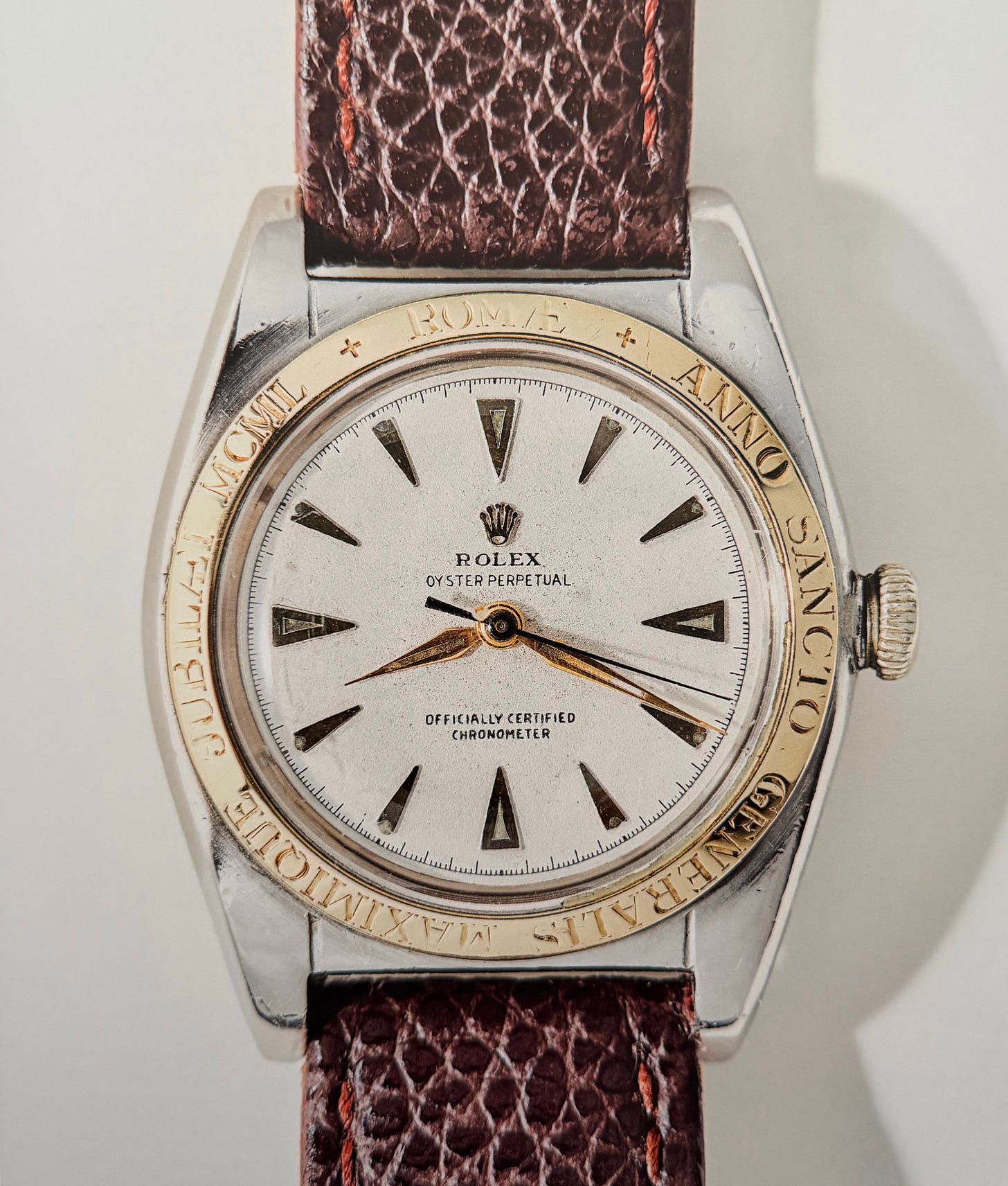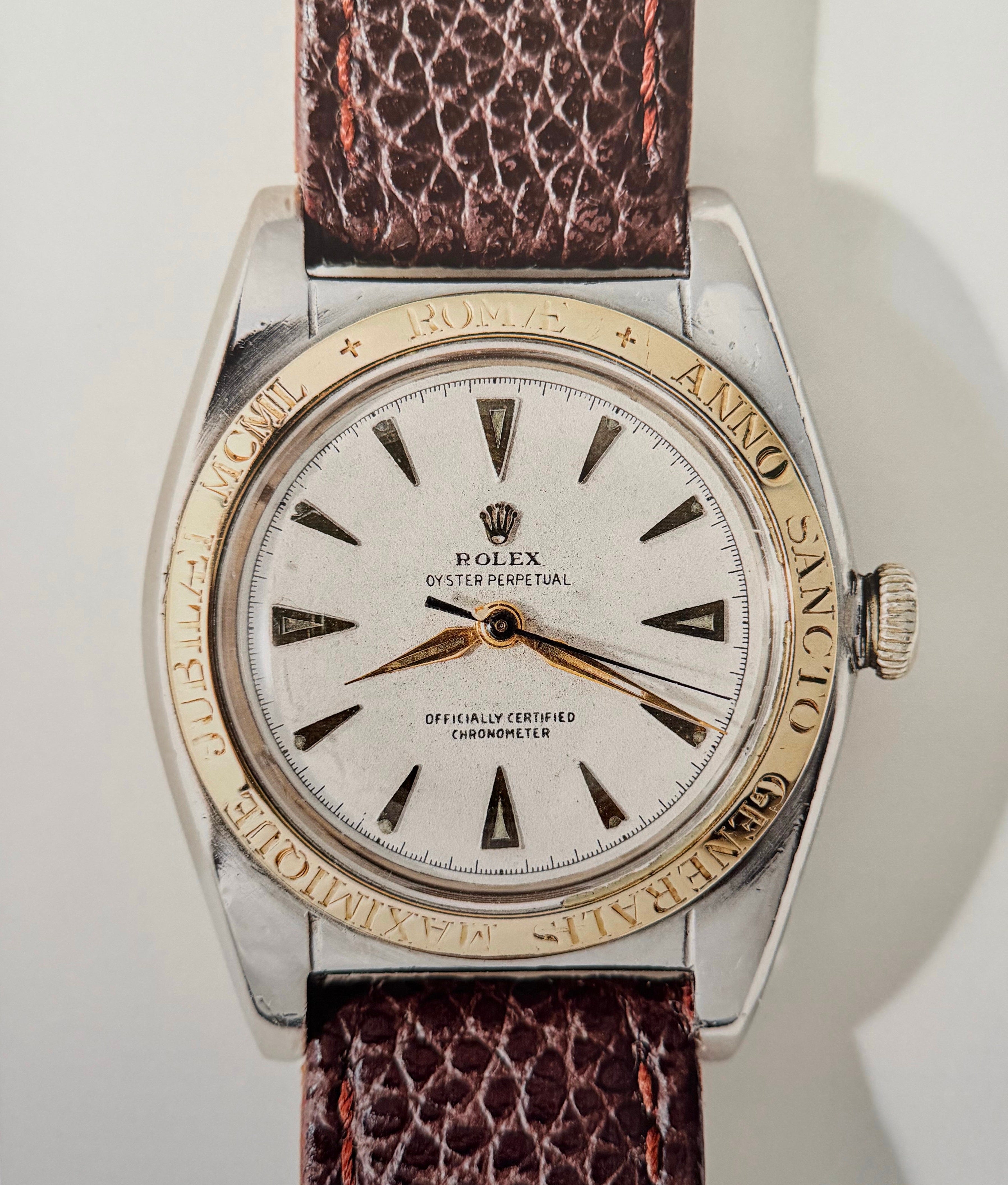 These hooded Bubblebacks (pic below) were unfashionable by 1950, but Dowling reckons they’re some of the most exotic cases Rolex ever made for men’s watches. The Holy Year Jubilee Bubbleback (pic above from the book) was one of the last original-style Bubblebacks, made as a special edition for a Catholic Church event. The 1950 Jubilee marked five years since World War II ended, making it a jubilee of reconciliation and forgiveness.