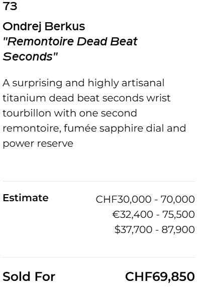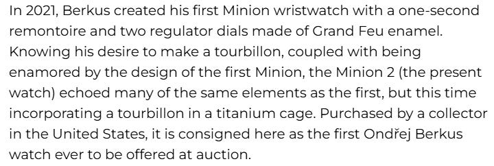 This wasn’t actually the first Berkus at auction, despite what Phillips claimed in their catalogue essay. Back on 9 November 2025 in Geneva, a Berkus “Remontoire Dead Beat Seconds” sold for 69,850 CHF. That’s around $50k less than the Minion 2, but it was also Phillips who auctioned it. The Geneva catalogue even stated “we are delighted to offer one of his creations for the first time in an international auction room.” So when the New York catalogue claimed “it is consigned here as the first Ondřej Berkus watch ever to be offered at auction”… well, that’s just not true!