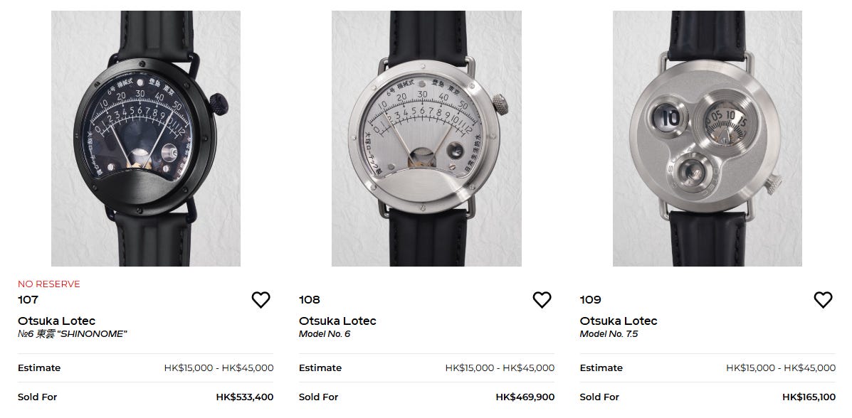 A few weeks after the GPHG win, three of his watches went to auction at Phillips’ TOKI sale in Hong Kong4. Both the No. 6 and its Shinonome variant hammered at about ten times their upper estimates (i.e. ~£50,000). These watches retail for between ¥400,000 and ¥800,000, so roughly ~£2,000 to £5,000, so the auction results were… wild.