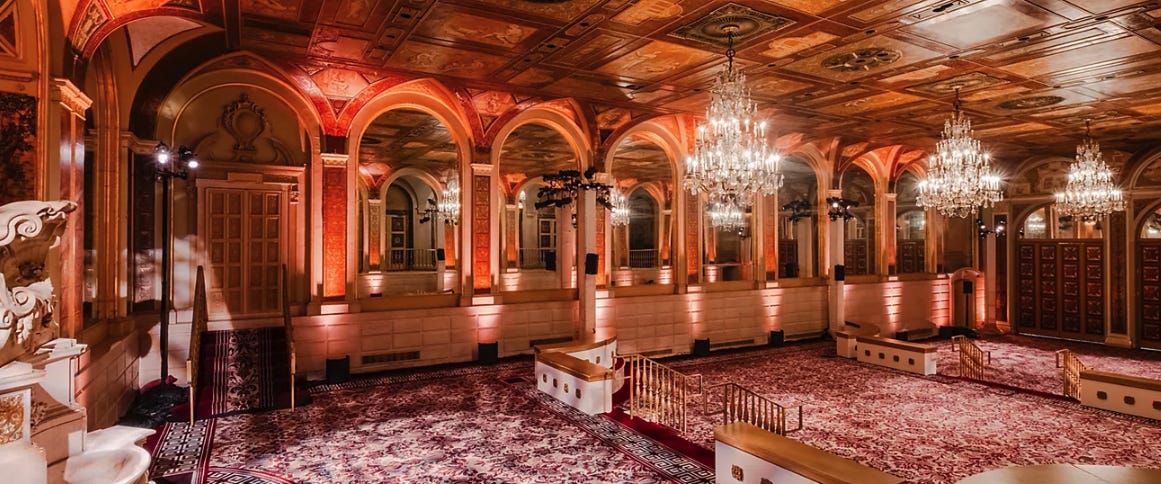 It’s a fantastically decorated and opulent room. The architecture certainly grabbed my eye, but what hit me first was the energy of the room. Unlike the stock photo of an empty room which I shared above, the room was packed with people wall to wall.