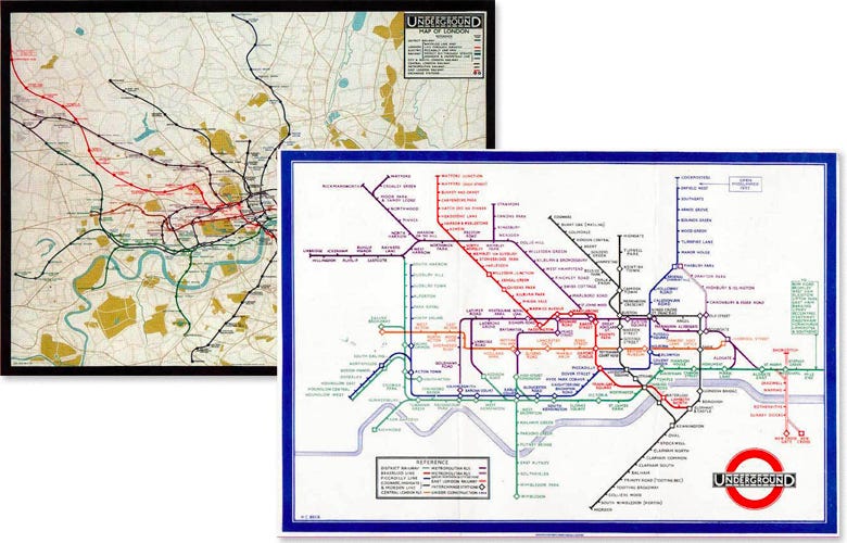 Ok, back to the start… we can now talk about that pipe... 🎷. Harry Beck is not a well-known man, but millions of people in London enjoy his work … daily! In the early 1900s, as the London underground transport system was expanded, commuters faced confusion with the original map of the underground, which aimed to represent geographic reality. In 1931 Harry Beck introduced a groundbreaking alternative, abandoning locational accuracy and creating a conceptual representation focused on easy navigation.