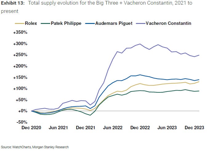Supply Levels: Total supply levels for the Big Three and Vacheron Constantin remained flat or decreased in 2023, despite major sell-offs in 2022. However, inventory levels remained historically elevated.