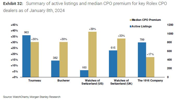 CPO Premiums: Rolex CPO dealers continued to charge significant premiums, with pricing for Tourneau, Bucherer, and Watches of Switzerland typically between +30% and +40% higher than non-certified dealers. The 1916 Company had a more competitive median CPO premium of +17%.
