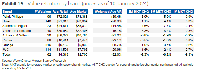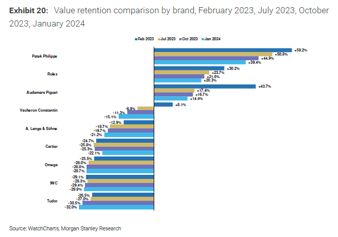 Rolex: The report emphasizes Rolex's continued outperformance, with prices declining by only -8% in 2023. The brand maintained a positive value retention trend, even in the face of the industry-wide challenges.