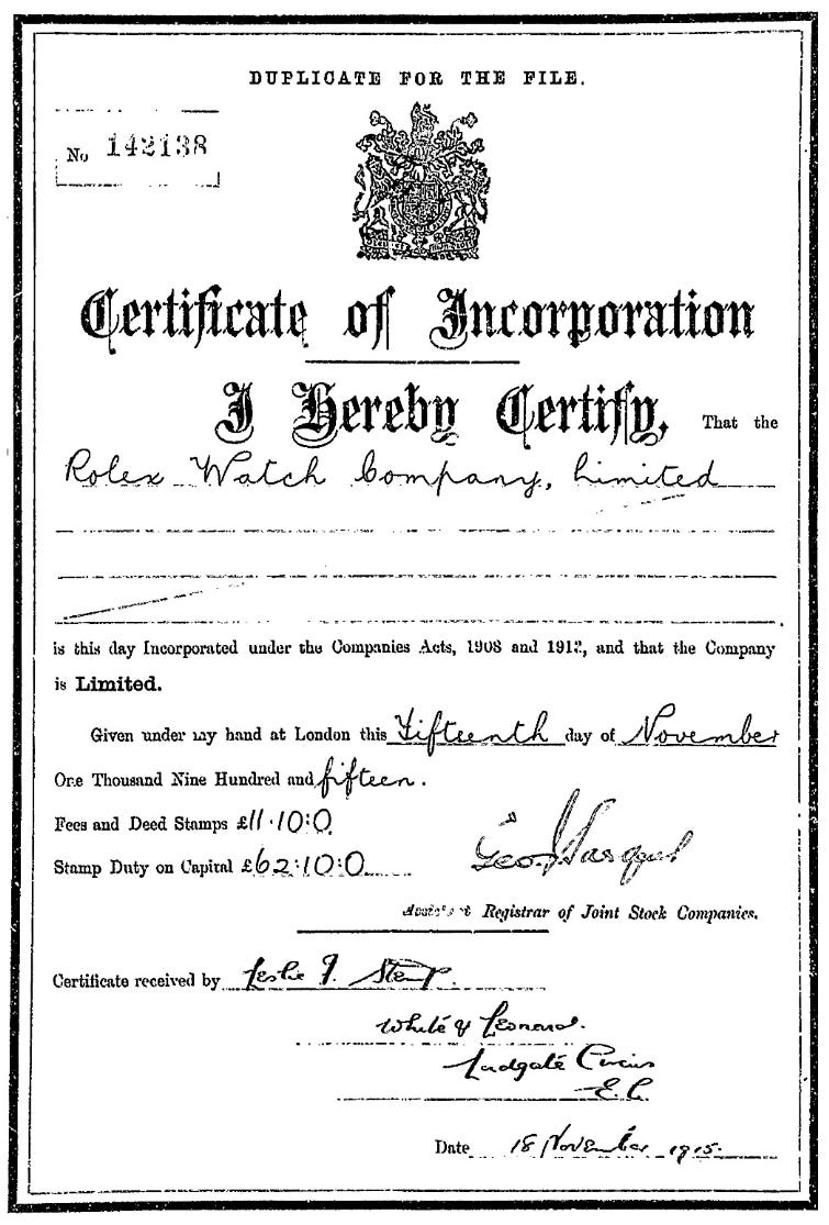 Who knows… this could easily be some post-hoc myth making, but the name Rolex proved to be a masterstroke. Short, distinctive, and maybe a little suggestive of the rotation of watch hands; either way, it was registered as a trademark in 1908. Initially, this was just used as a brand name for products from Wilsdorf & Davis (i.e. it wasn’t the company name).