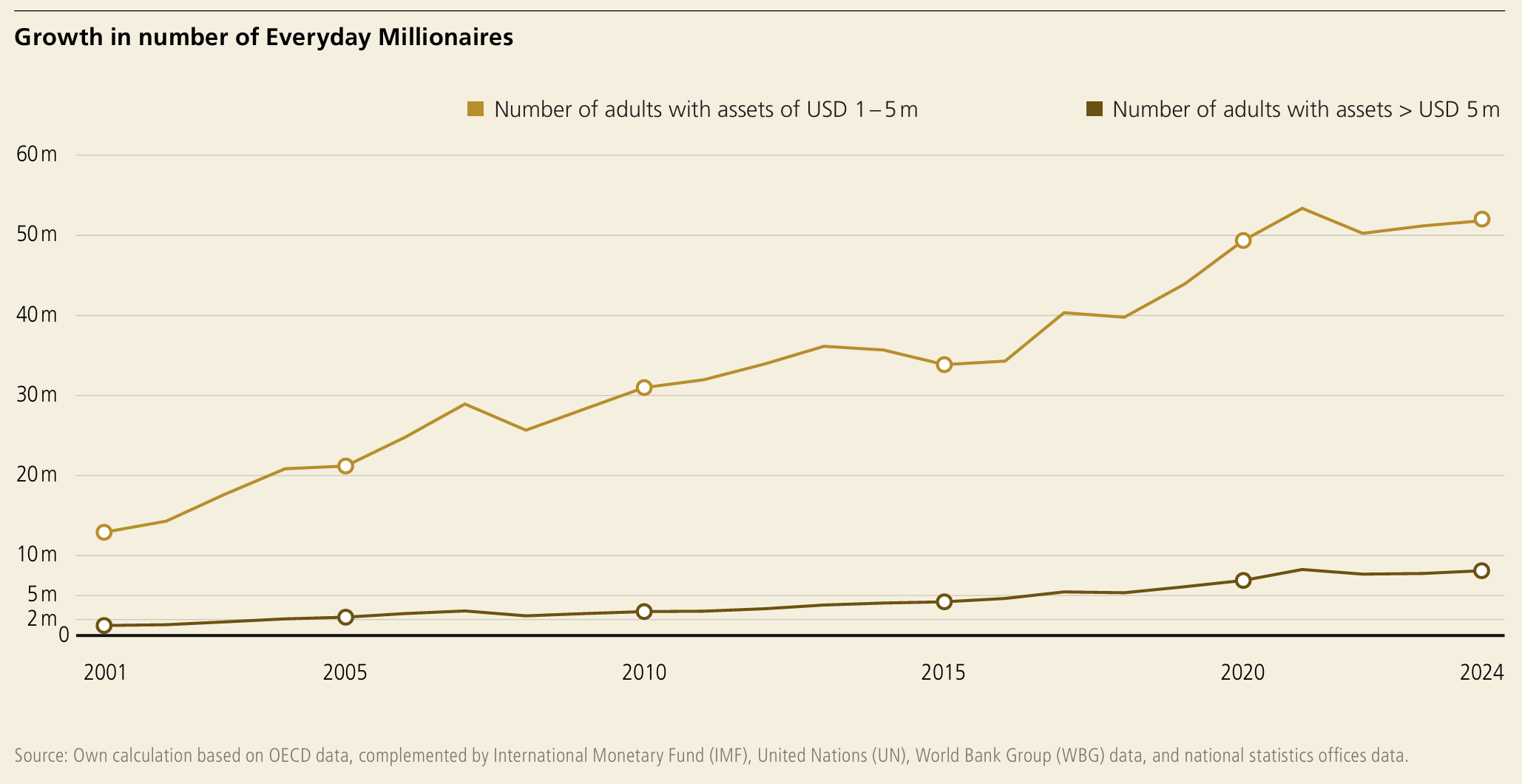 Nearly 60 million USD millionaires globally own around USD 226 trillion in assets. Meanwhile, the bottom half of the world’s adult population owns barely 1% of total global wealth. The Gini coefficient2 shows inequality has actually diminished marginally since 2000 globally, but within specific countries like the US, UK, and Thailand, it’s rising.
