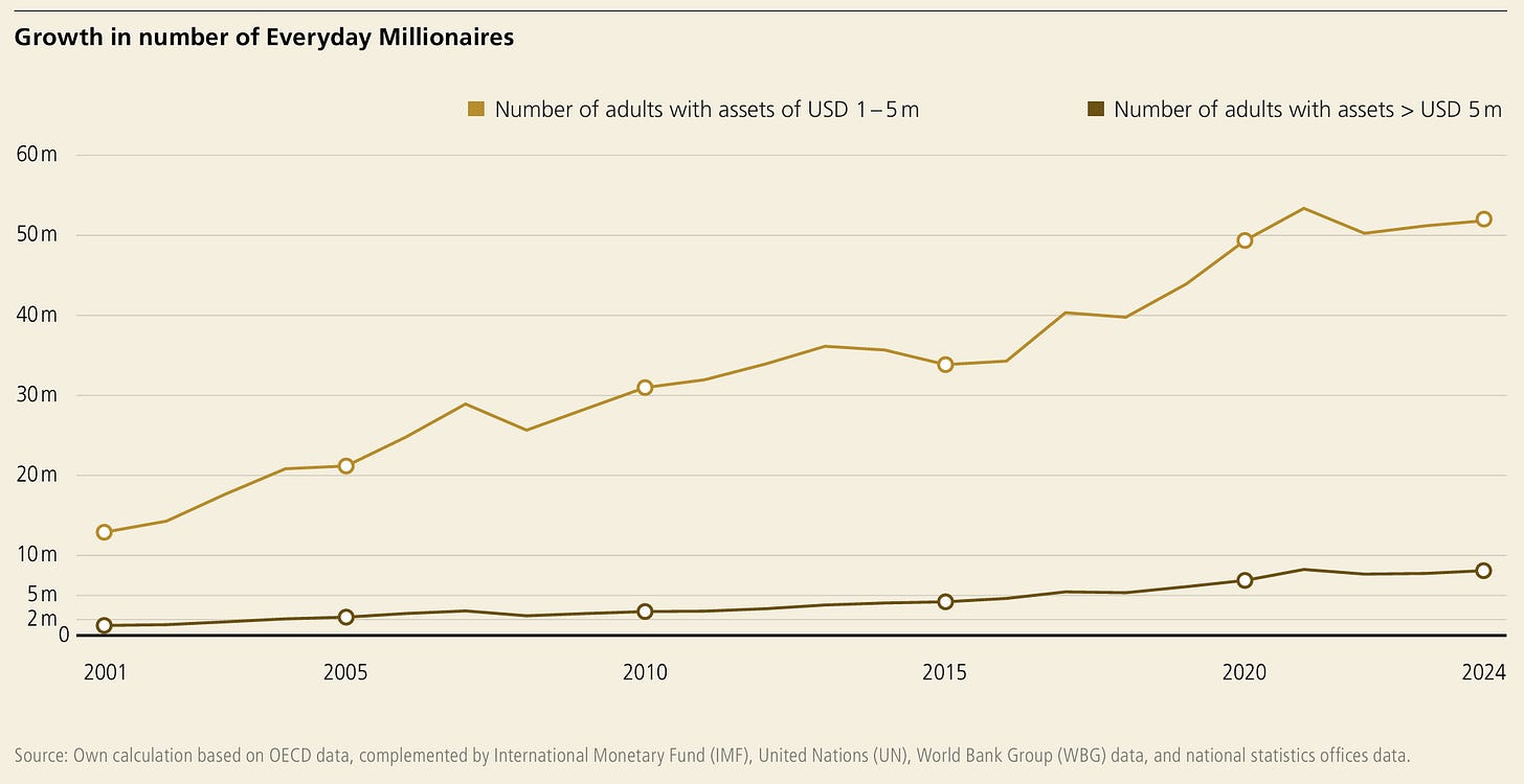 These are individuals with assets between USD 1-5 million; globally, there are ~52 million of these up-and-comers, and collectively they control around USD 107 trillion in wealth (which is almost as much as everyone worth more than USD 5 million combined, at USD 119 trillion!).
