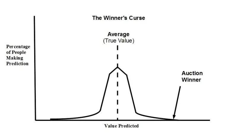 When it comes to the winner’s curse, we can spend hours reading about biases and the impact of information asymmetry in auctions. Moser (2018), did an experiment where he had two stages of bidding, and in the second phase he revealed whether the bids in the first phase were winning or not. He found that after being provided with the information at the end of stage 1, these bidders were more likely to avoid the winner’s curse.