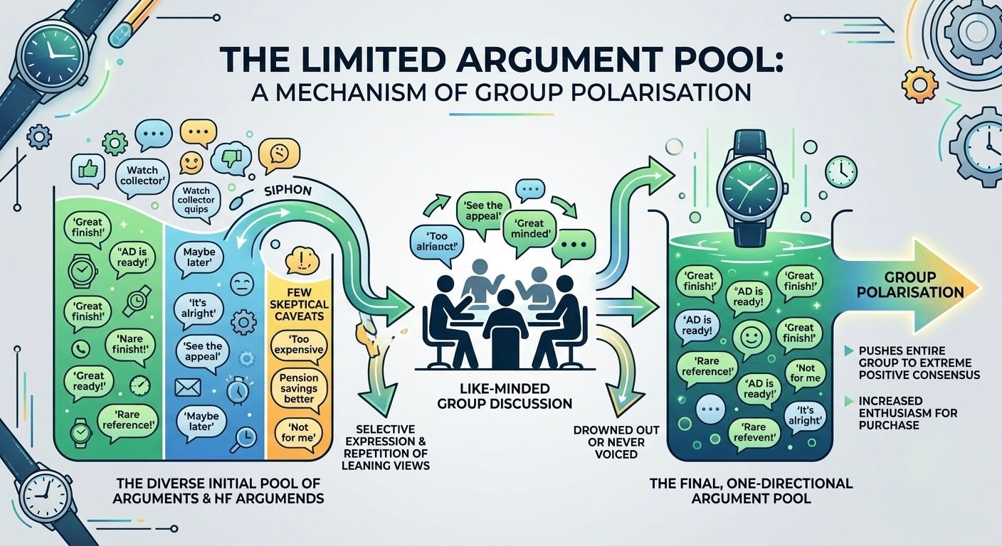 The second mechanism Sunstein covers is a limited argument pool. When a group is already leaning in a particular direction, the arguments that surface during a discussion will naturally be skewed in that direction. If a large proportion of your group are mildly enthusiastic about a watch, the discussion will produce far more reasons to like it than reasons to be sceptical. The few sceptical thoughts someone might have had get drowned out, or simply never get voiced at all. So in total, maybe you hear 10-20 arguments in favour, 1-5 lukewarm caveats, and 1-5 ‘serious’ objections... odds are, you will end up more enthusiastic than you were before starting.