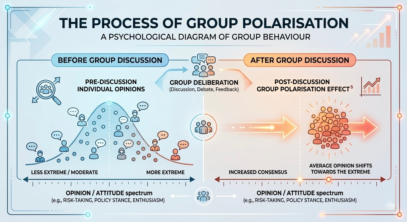 In the first scenario, the group looked like a place for sharing opinions, but in reality, it ended up manufacturing enthusiasm. This phenomenon is called group polarisation, and you won’t be surprised to hear that it’s quite well-documented in social psychology.