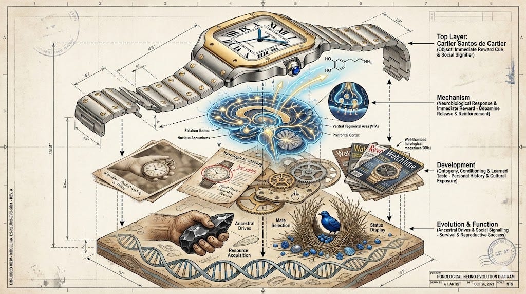 Tinbergen actually excluded intentions from his original framework because he was studying animals and didn’t want to anthropomorphise2. Anyway, we’re discussing watch collectors, who definitely do have intentions - sometimes confused intentions, sometimes conflicting intentions, and oftentimes dumb intentions… but yeah, intentions nonetheless.